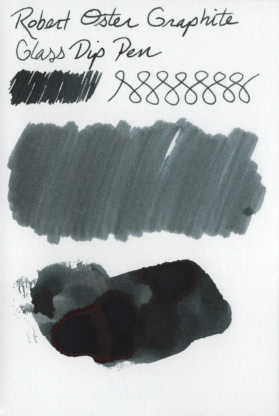Robert Oster Signature Ink Samples (Astorquiza Rot, Charcoal, Graphite). Image is scanned. Samples are created on Rhodia Dot Grid paper using a Blue Pumpkin dip nib, a Speedball C-4 Calligraphy nib, cotton swabs, and a paint spatula.