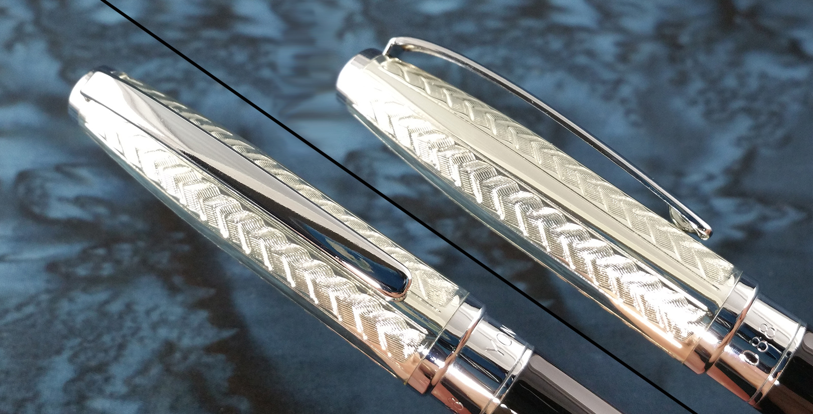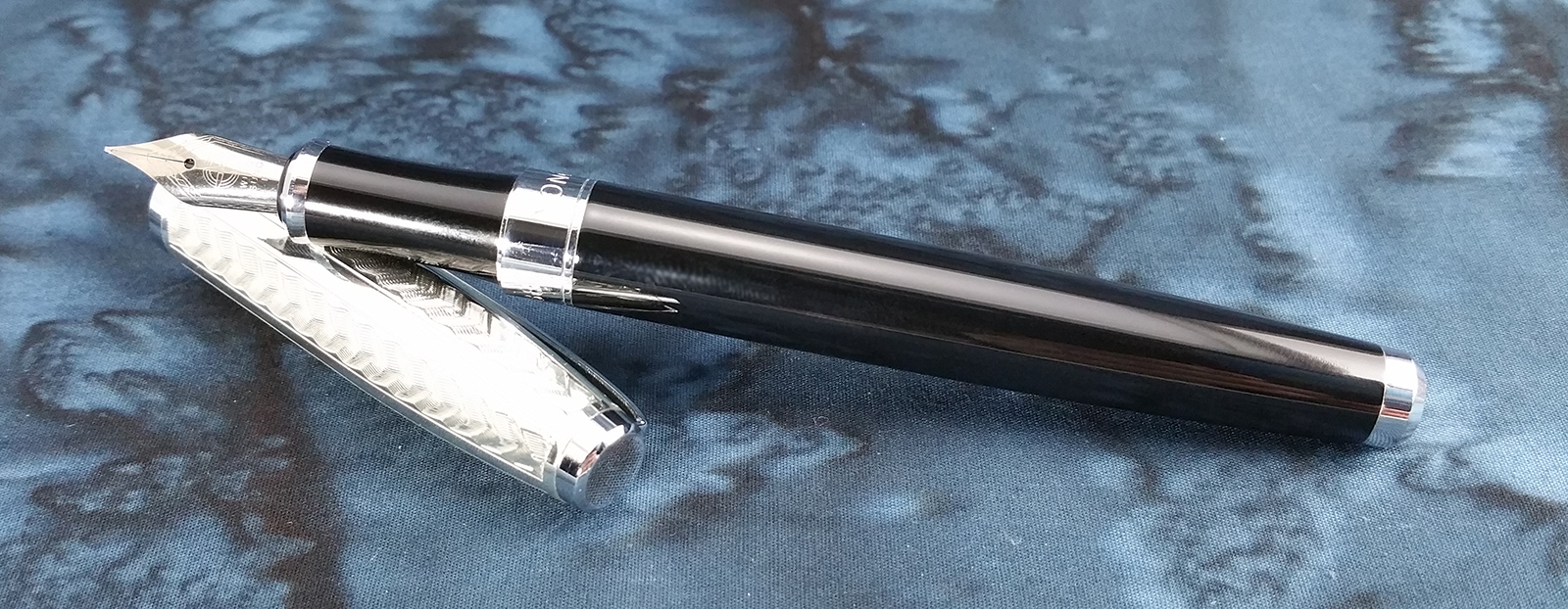 And the cap is kind of a mess. The etched chevron pattern looked nice in pictures, but doesn’t look as well executed in person. The color of finish on the cap body is slightly yellower than the other chrome parts (finial, end cap, center band, cap band, section lip, and clip). I didn’t notice this at first, but now I can’t un-see it. Also, the plating on the cap body has a chip in it (I got the pen that way), so I don’t think the plating is done well.